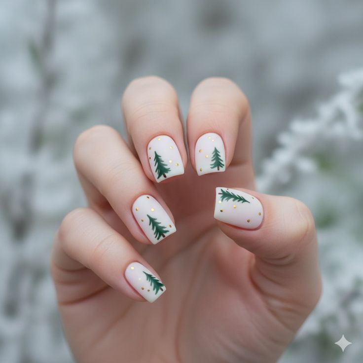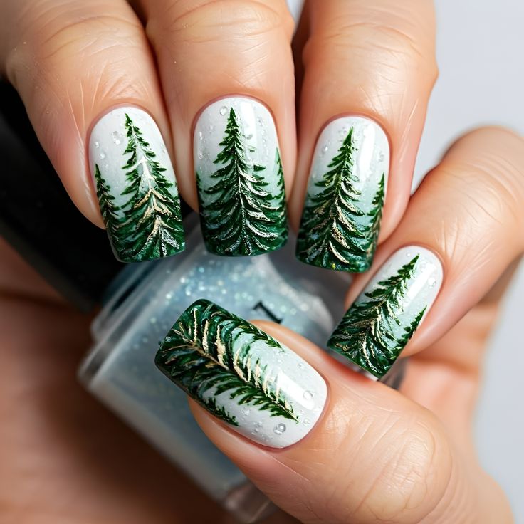 Draw tiny, basic tree shapes on all of your nails, or even just one as an accent, to create this design. To give the trees a festive feel, keep them simple or add small details like ornaments or glitter. It’s adorable, entertaining, and ideal if you want to keep your nails a little more whimsical.