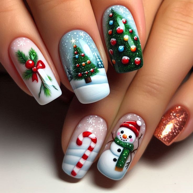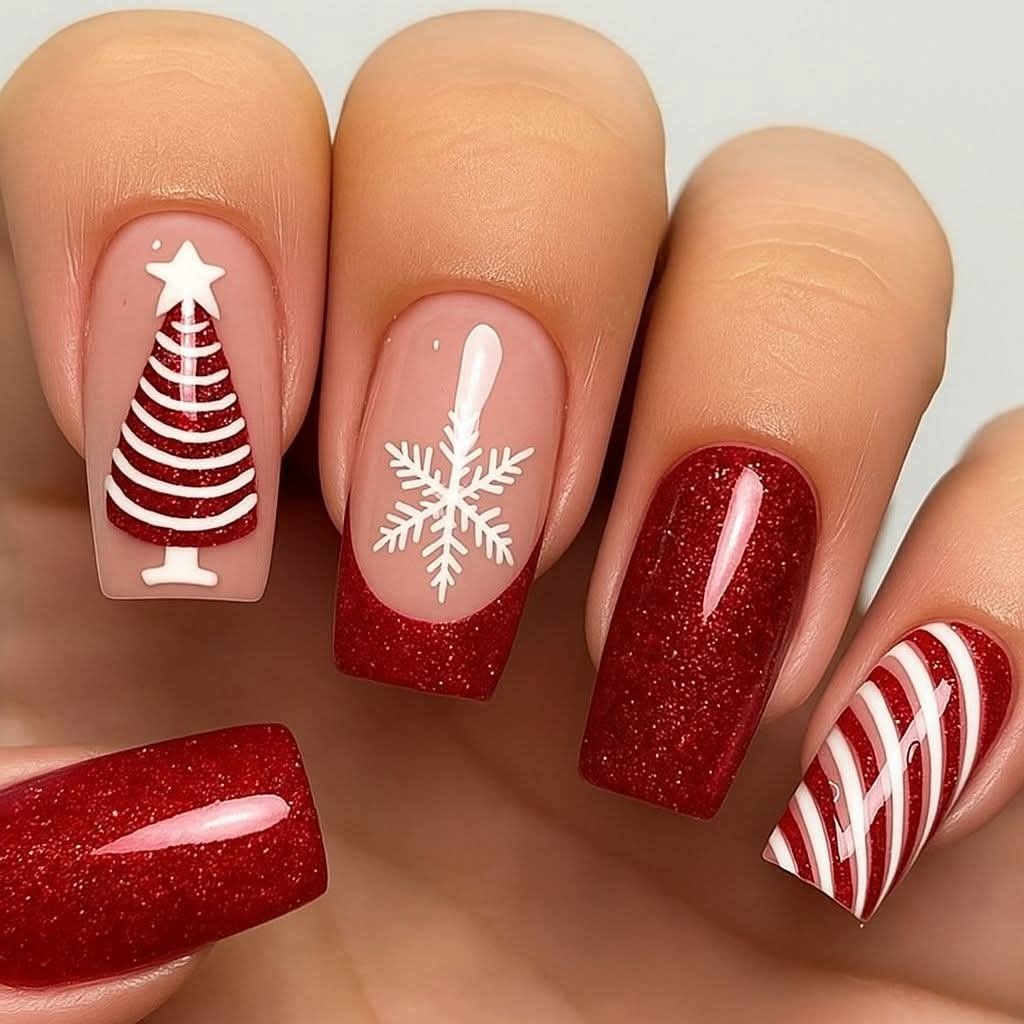 Paint your trees with red and white candy cane stripes, giving a sweet, festive twist to the traditional Christmas tree design. You can keep the rest of the nails simple with a nude or green background to let the striped trees really pop. This design is cute, fun, and perfect for anyone who loves a little bit of whimsy with their holiday nails.