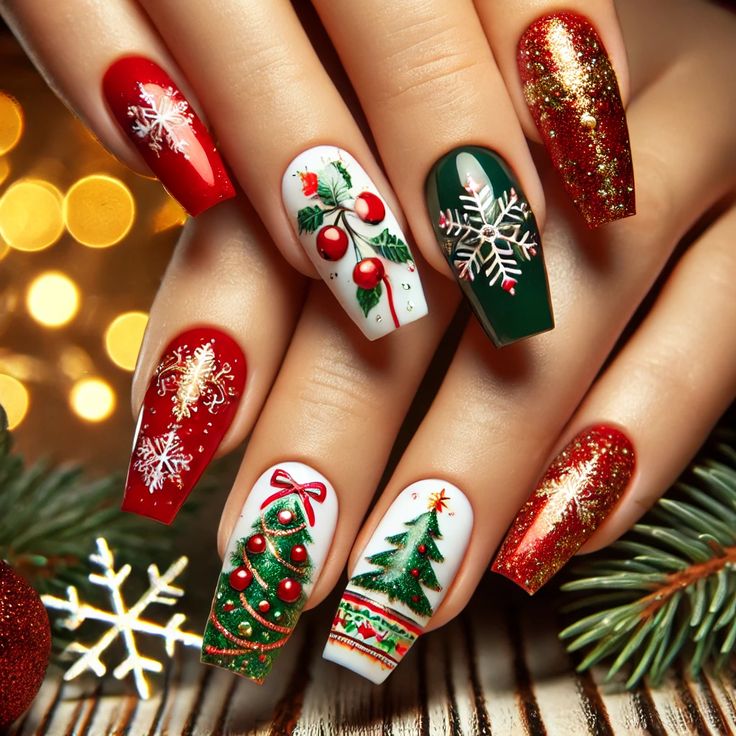 To resemble ornaments, you can add tiny red, white, or gold dots. If you’re feeling particularly festive, you might even add a star at the top. This style is ideal for giving you a warm, festive feeling at your fingertips.