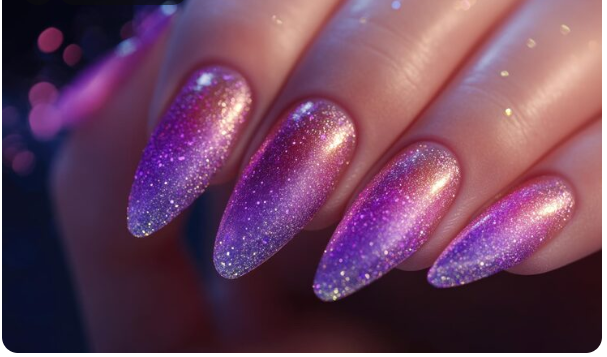 For an eye-catching, glittery look, try a deep purple base with lots of glitter. This design is luxurious and entertaining, like having a party at your fingertips. Adding glitter to purple, which is already a rich, striking color, gives it an extra sparkle that’s ideal for special events or anytime you want to stand out.