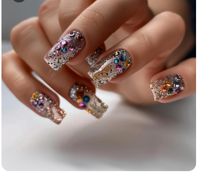 A fun, confetti-like effect can be achieved by covering a nude or clear base with tiny dots or colorful glitter pieces. This whimsical nail art looks like a celebration and is lighthearted. Perfect for anyone who enjoys a little whimsy and a splash of color.