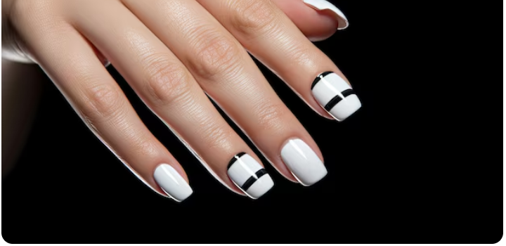 Bold and edgy is a black base with metallic silver accents. For a striking contrast, the silver can be added as lines, dots, or even abstract shapes. Anyone who enjoys a little drama and sophistication in their nail design will love this high-contrast look.