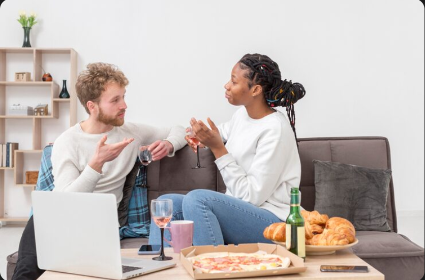 Sitting together rather than on opposite ends of the couch.
